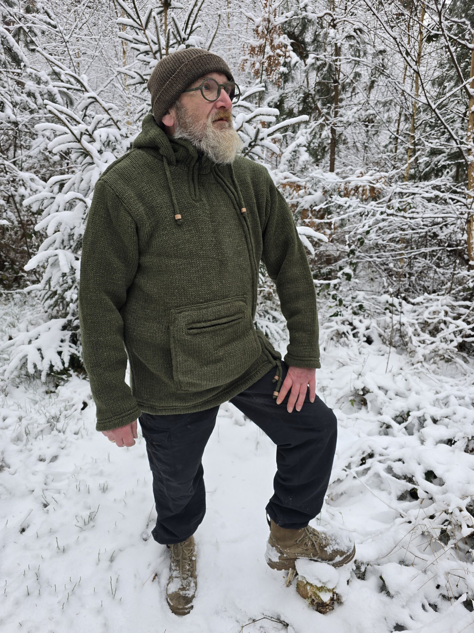 Unsere handgefertigte schwere Kapuzenjacke wird aus zwei Garnstränge gleichzeitig auf einer Handstrickmaschine zusammengestrickt, 100 % hochwertiger reiner Schafschurwolle und ist innen mit Polar Fleece ausgestattet, natürliches Gefühl mit jeder Berührung.